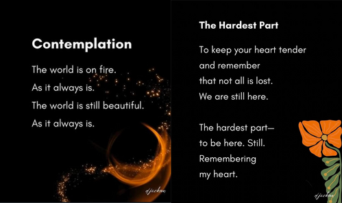 These two poems by author @d.jacksonpoetics (Drew Jackson) speak to the harshness and beauty of the world. May we hold space for both. What do the poems say to you?